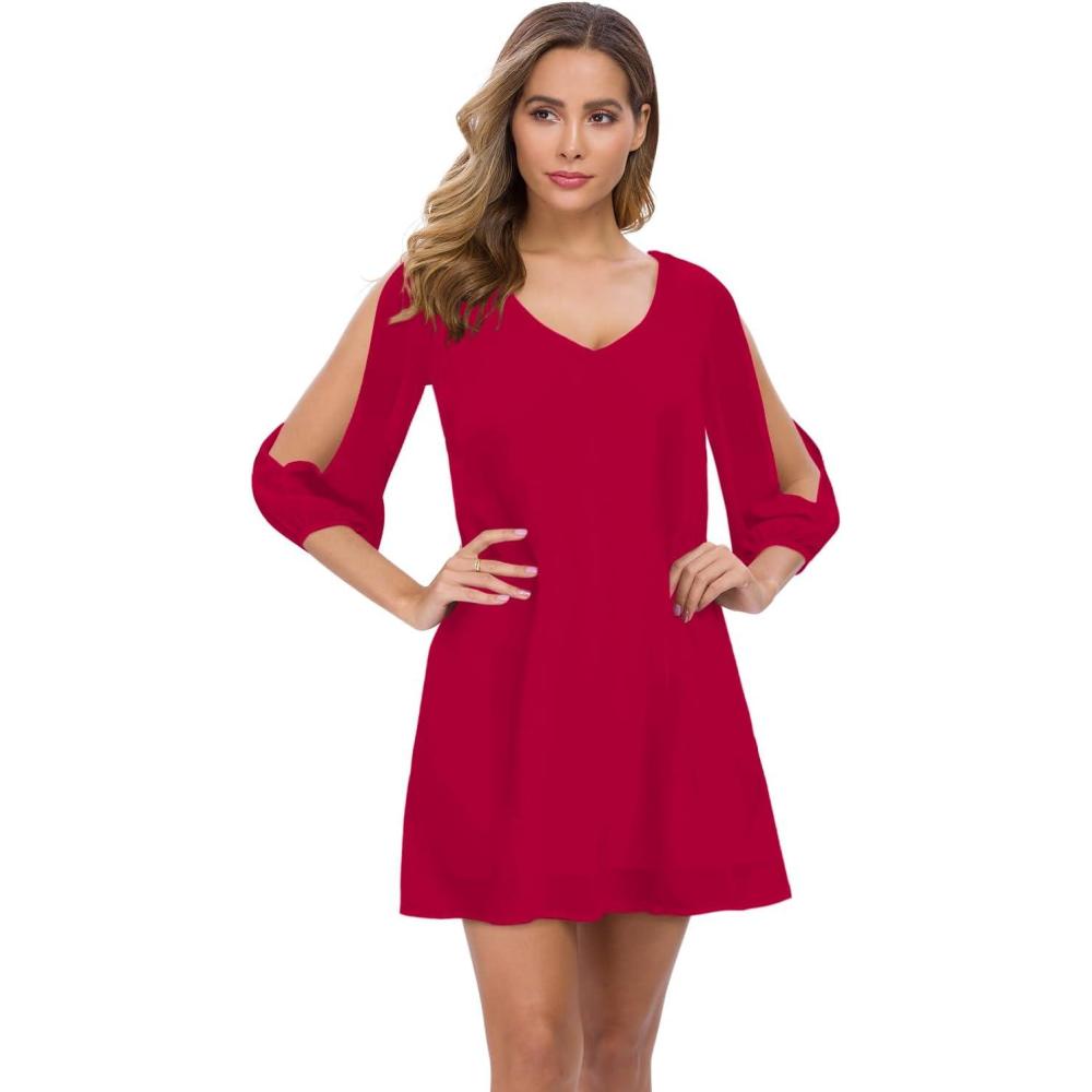 Shy Velvet Women's Casual 3/4 Sleeve V Neck Shift Dress Chiffon Short Party Dress(Red)