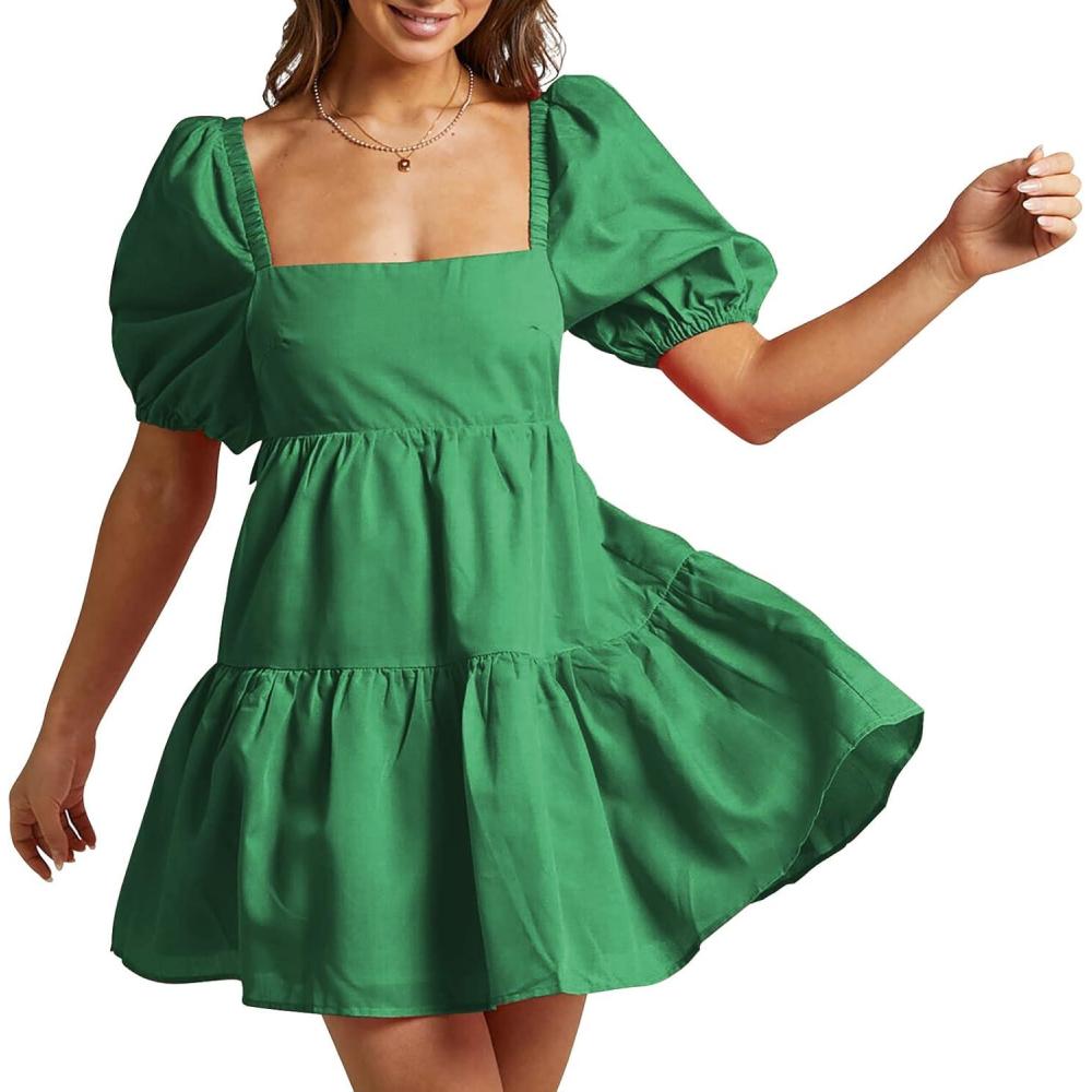 Shy Velvet Women’s Casual Party Mini Summer Dresses Square Neck Short Bubble Sleeve Babydoll Dress(Dark Green)