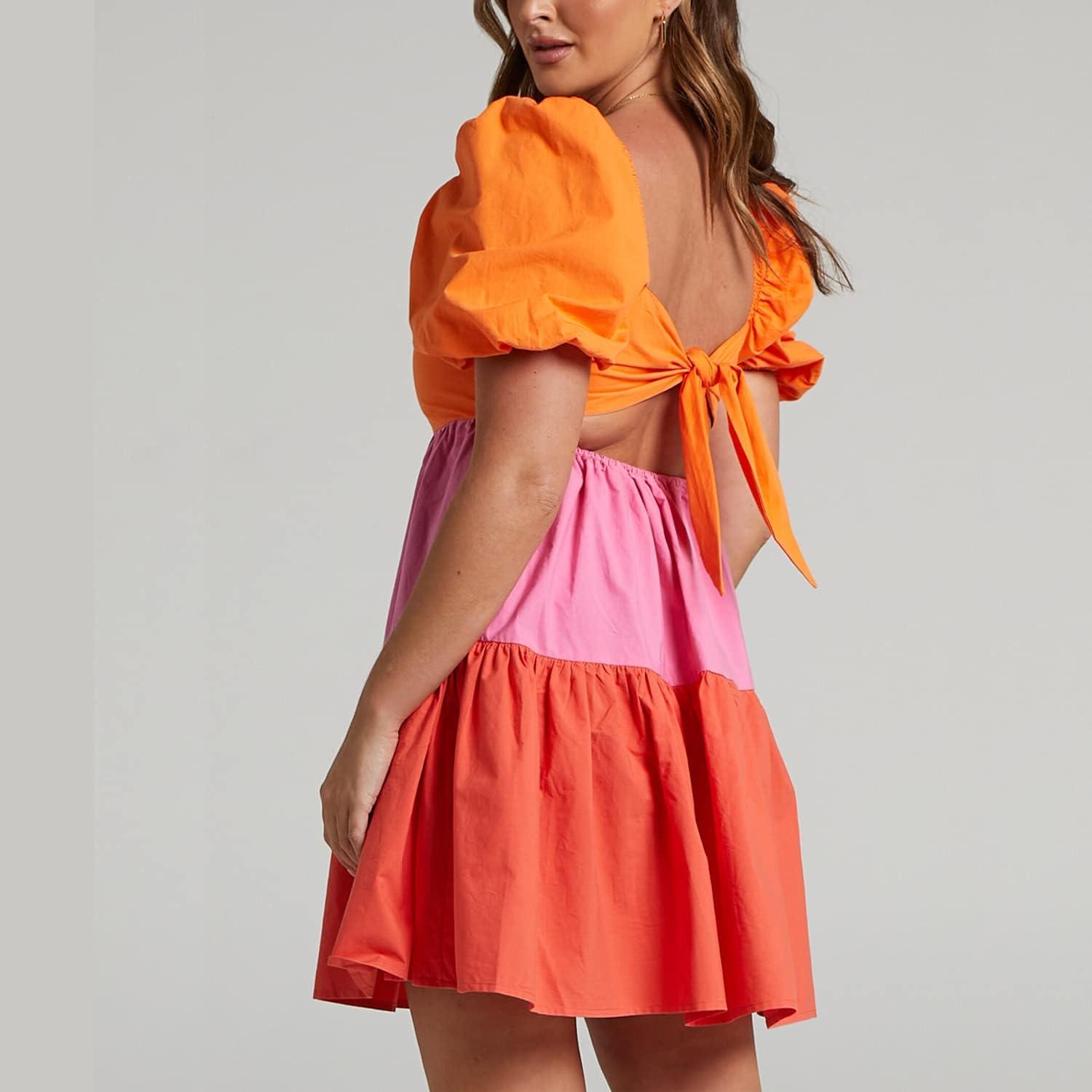 Shy Velvet Women’s Casual Party Mini Summer Dresses Square Neck Short Bubble Sleeve Babydoll Dress(Orange Red)