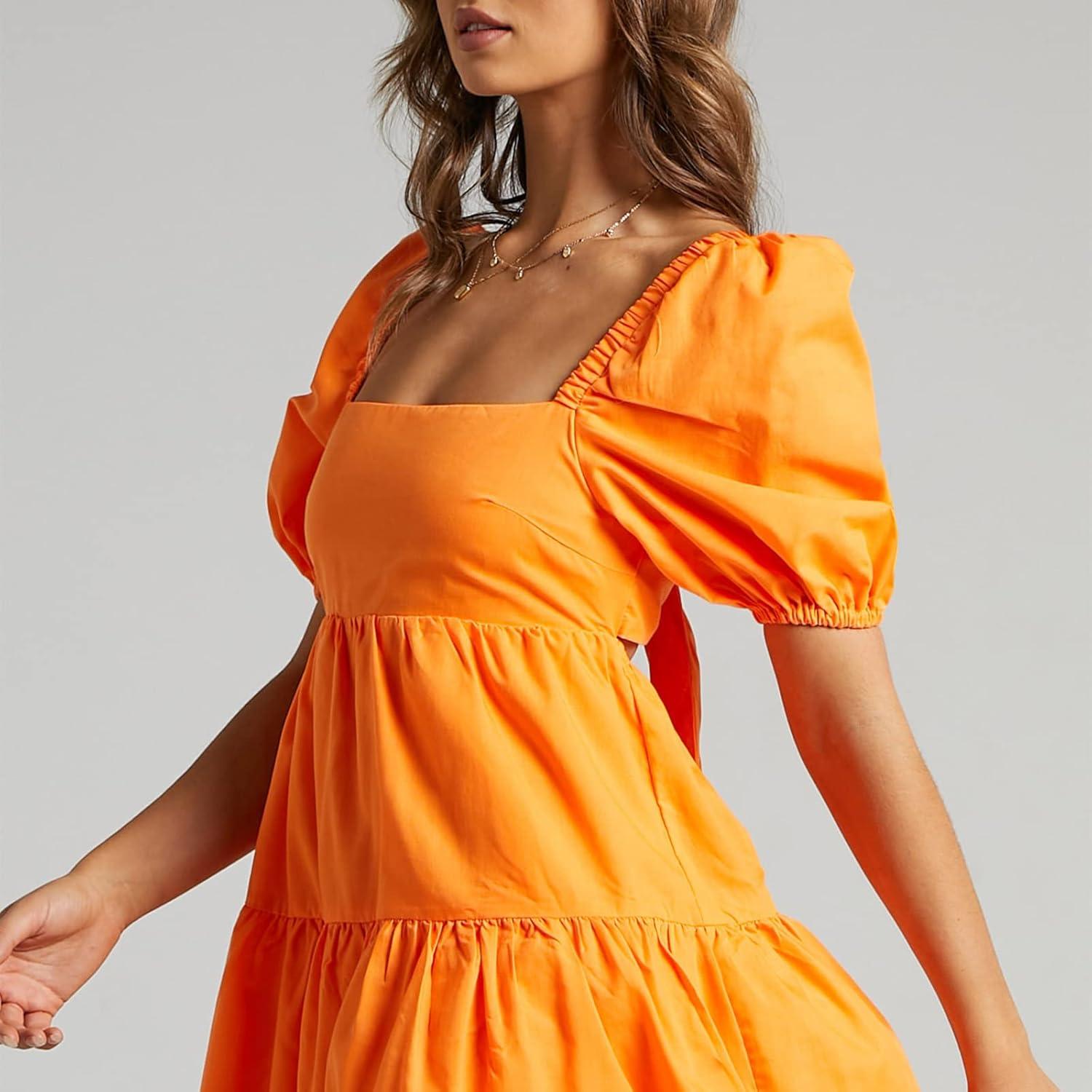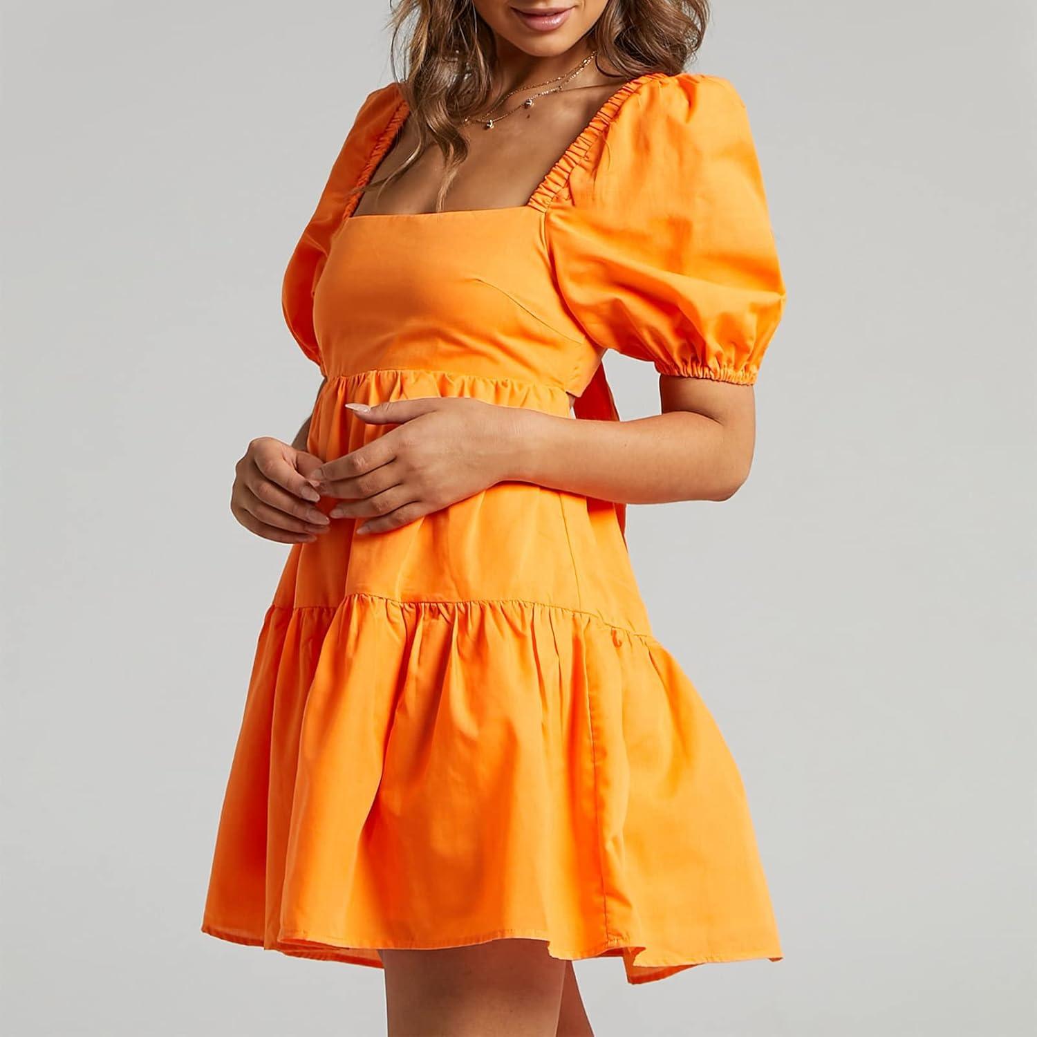 Shy Velvet Women's Casual Party Mini Summer Dresses Square Neck Short Bubble Sleeve Babydoll Dress(Orange)