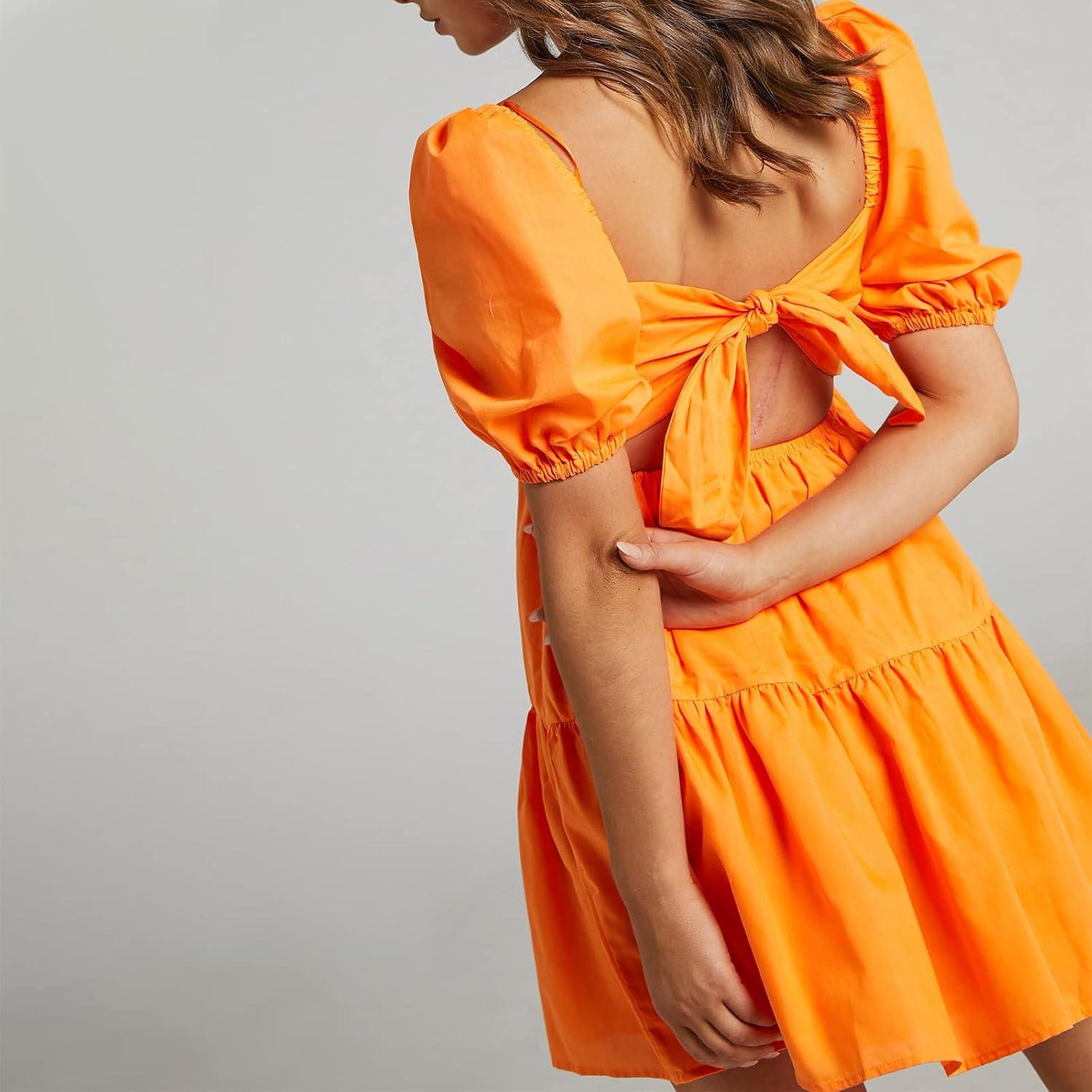 Shy Velvet Women’s Casual Party Mini Summer Dresses Square Neck Short Bubble Sleeve Babydoll Dress(Orange)
