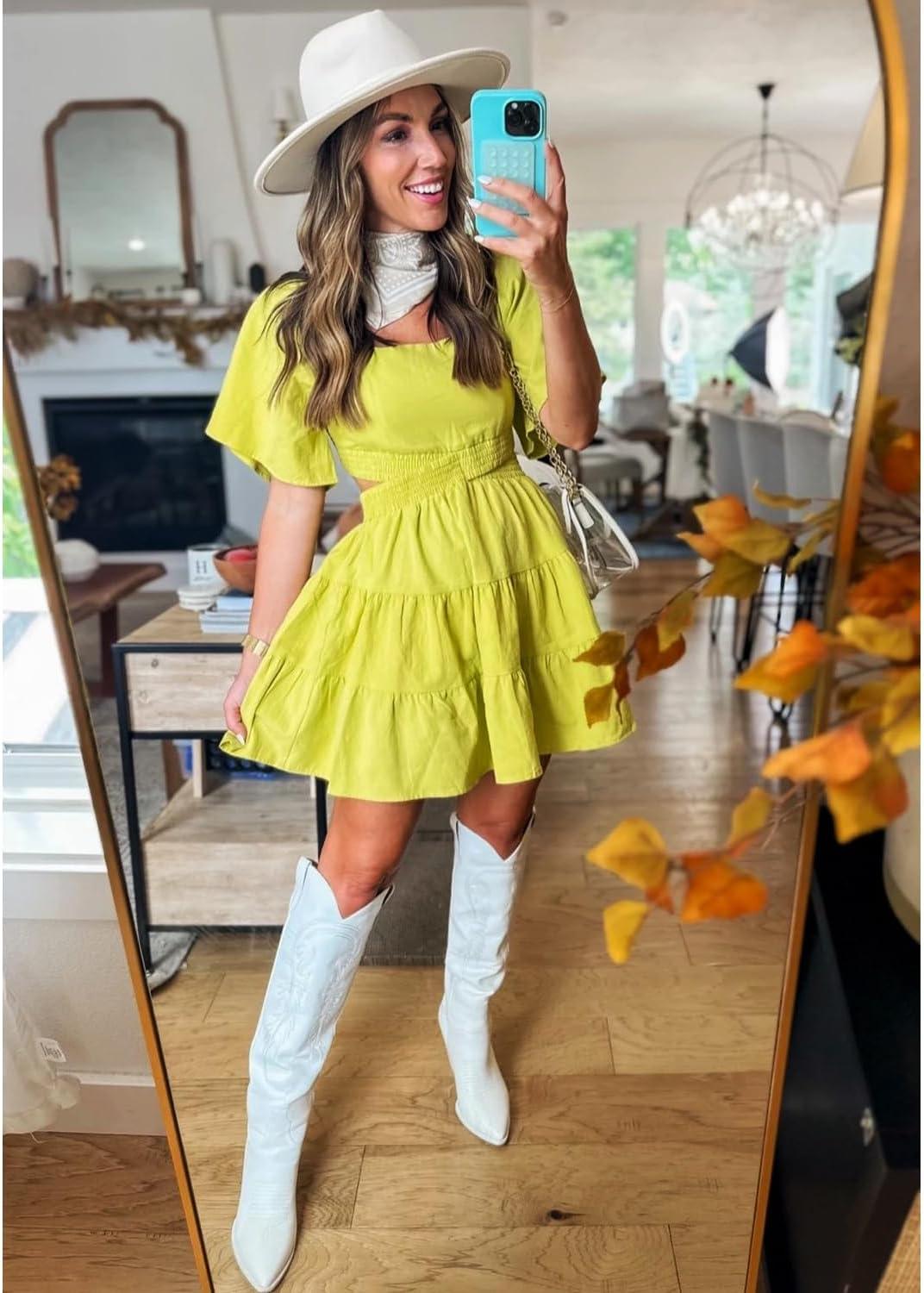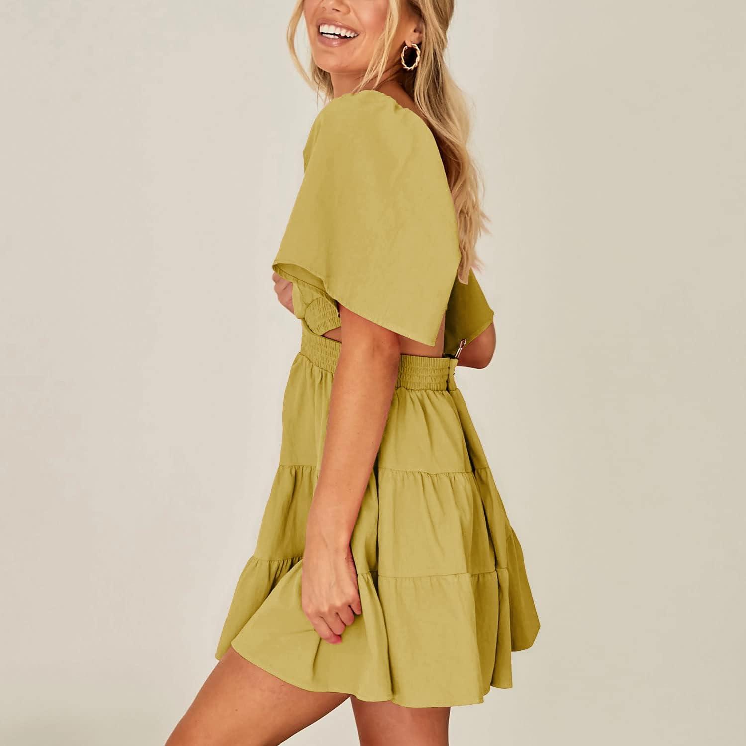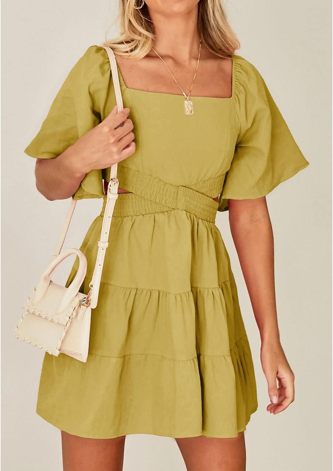 Shy Velvet Women’s Summer Dress Square Neck Short Sleeves Crossover Waist Casual Party Mini Dress(Yellow)