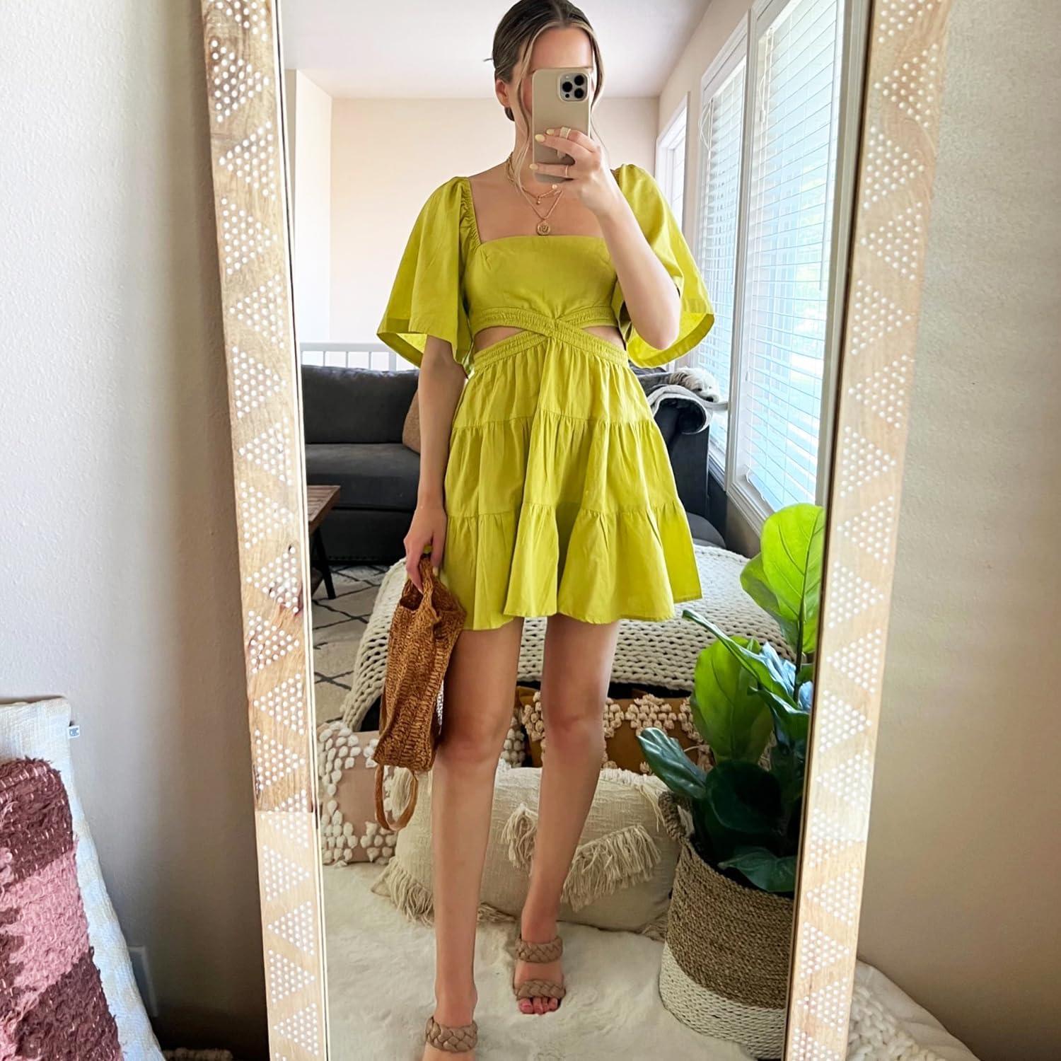 imageShy Velvet Womens Summer Dress Square Neck Short Sleeves Crossover Waist Casual Party Mini DressYellow