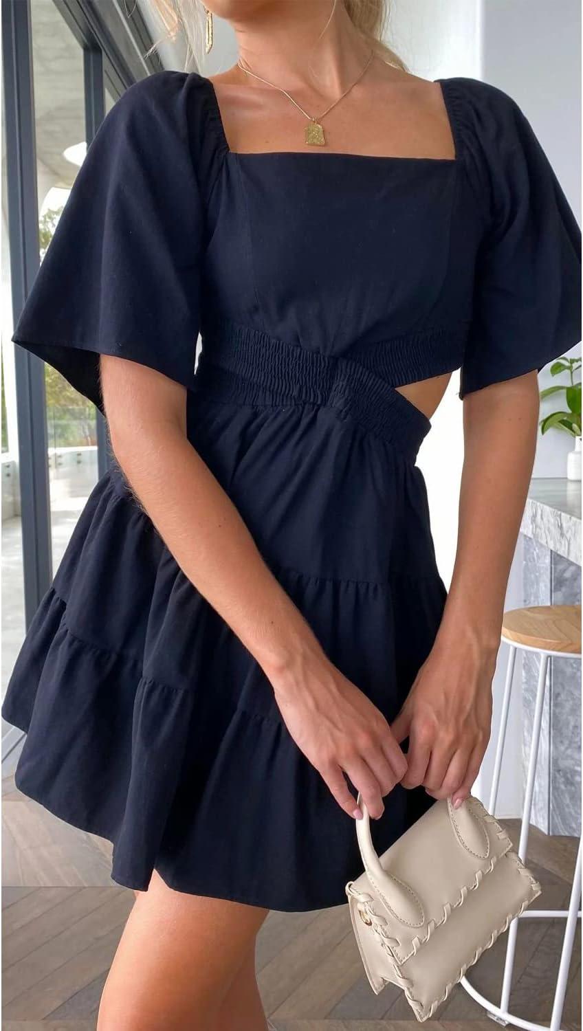Shy Velvet Women's Summer Dress Square Neck Short Sleeves Crossover Waist Casual Party Mini Dress(Black)
