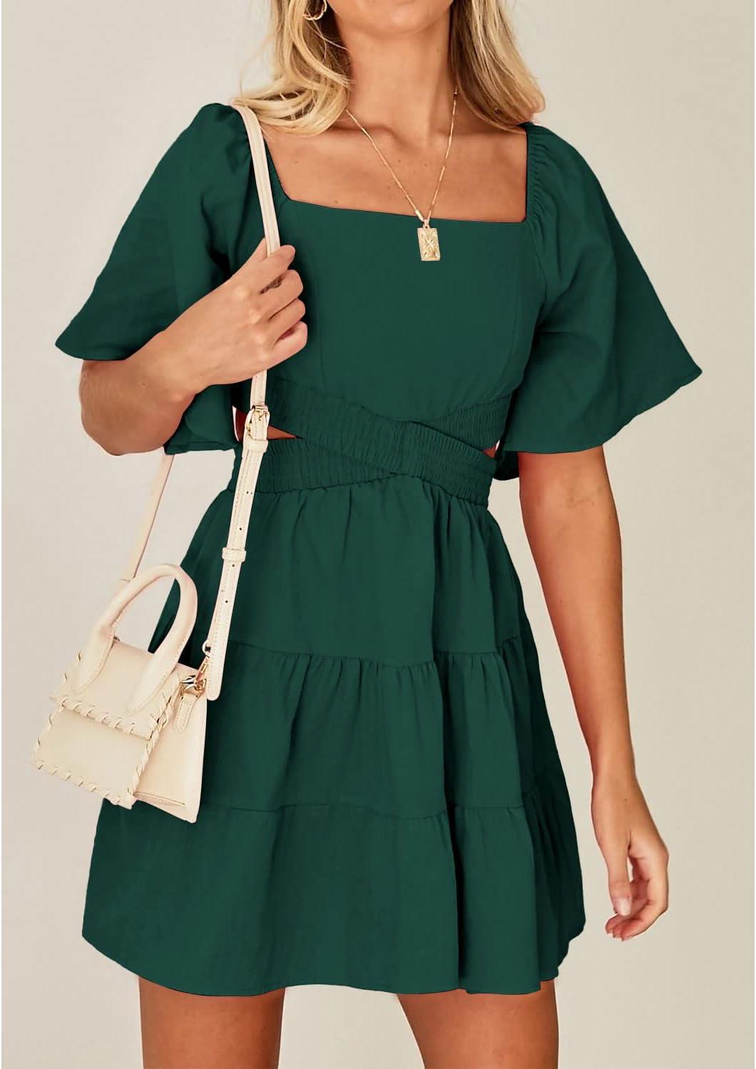 Shy Velvet Women’s Summer Dress Square Neck Short Sleeves Crossover Waist Casual Party Mini Dress(Dark Green)