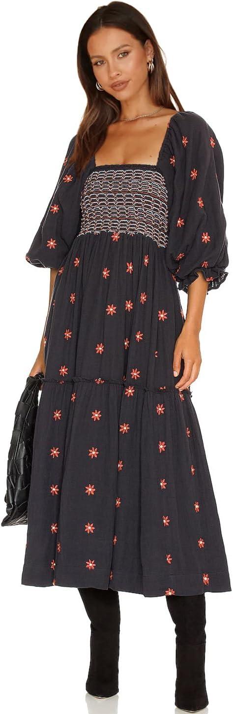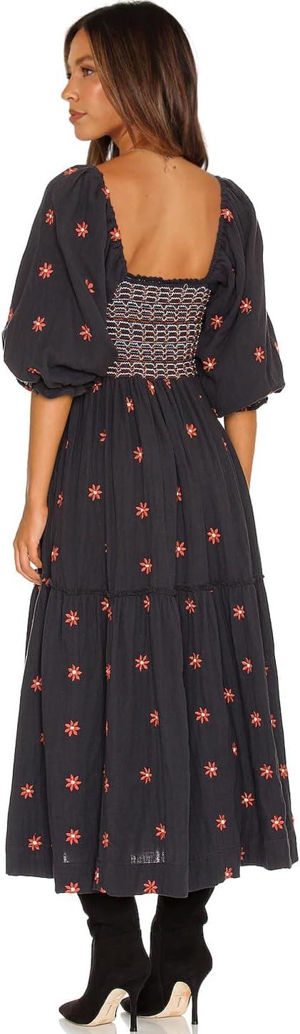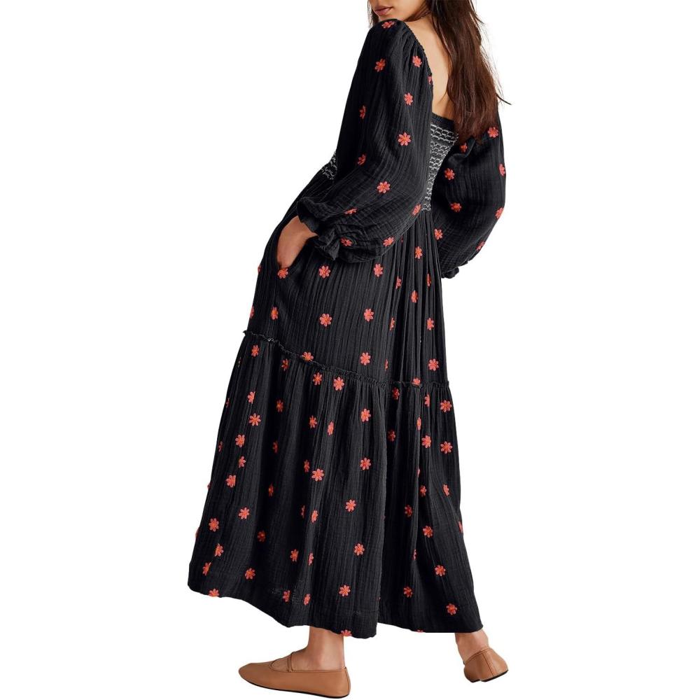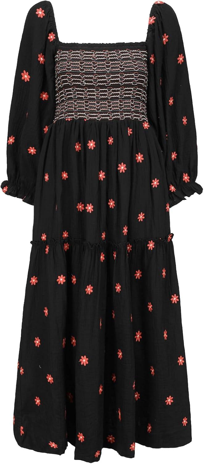 Shy Velvet Women's Summer Dresses 2024 Maxi Dress Long Sleeve Square Neck Embroidered Maxi Dress(Black)