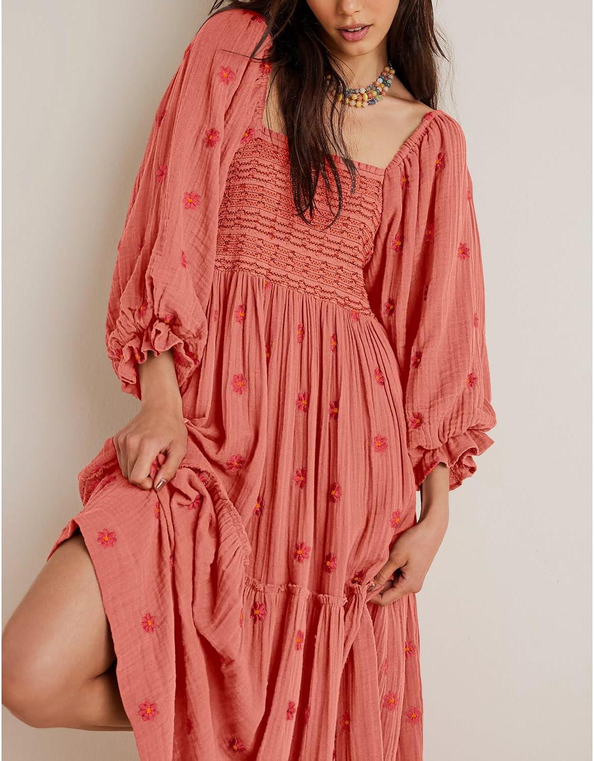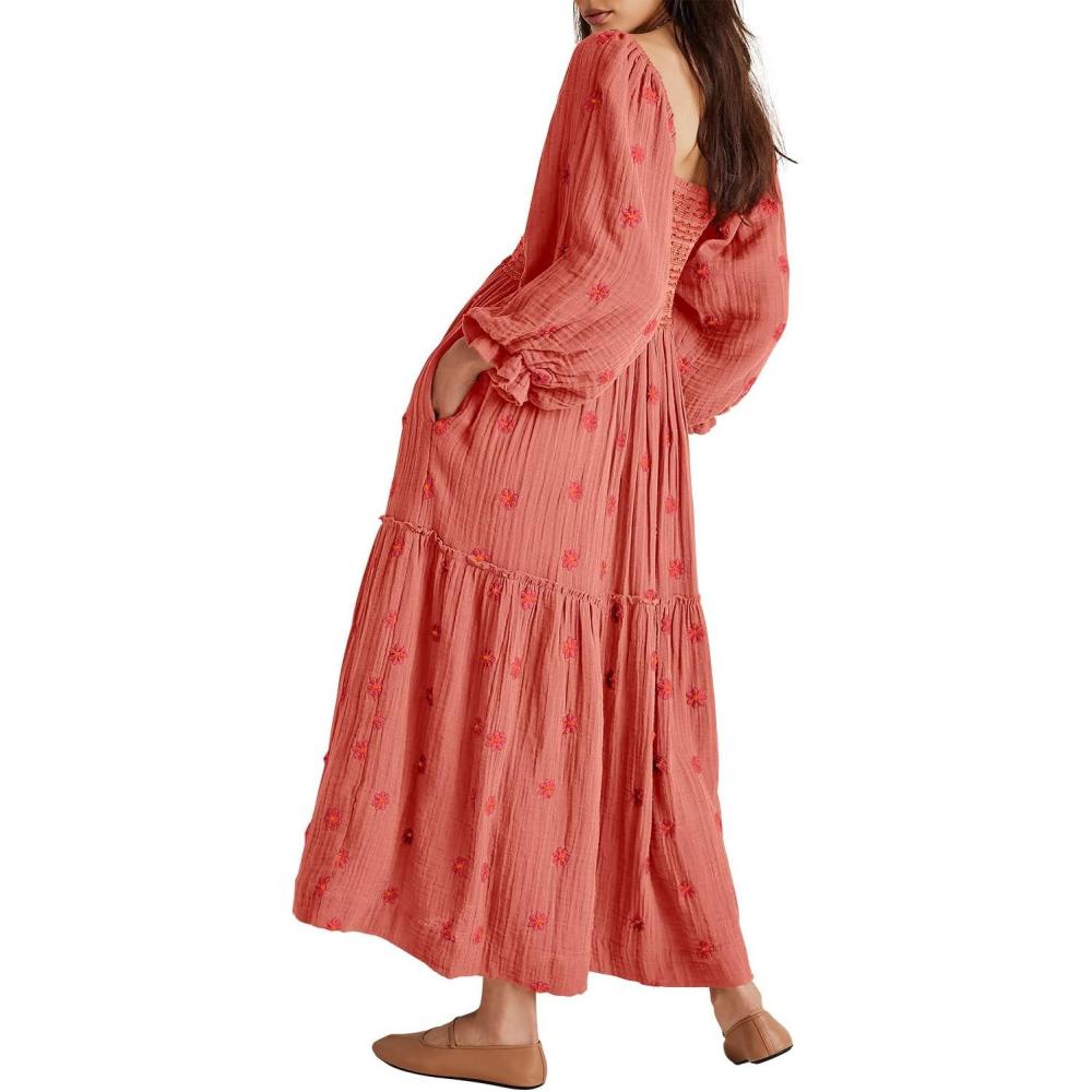 Shy Velvet Women's Summer Dresses 2024 Maxi Dress Long Sleeve Square Neck Embroidered Maxi Dress(Brick Red)